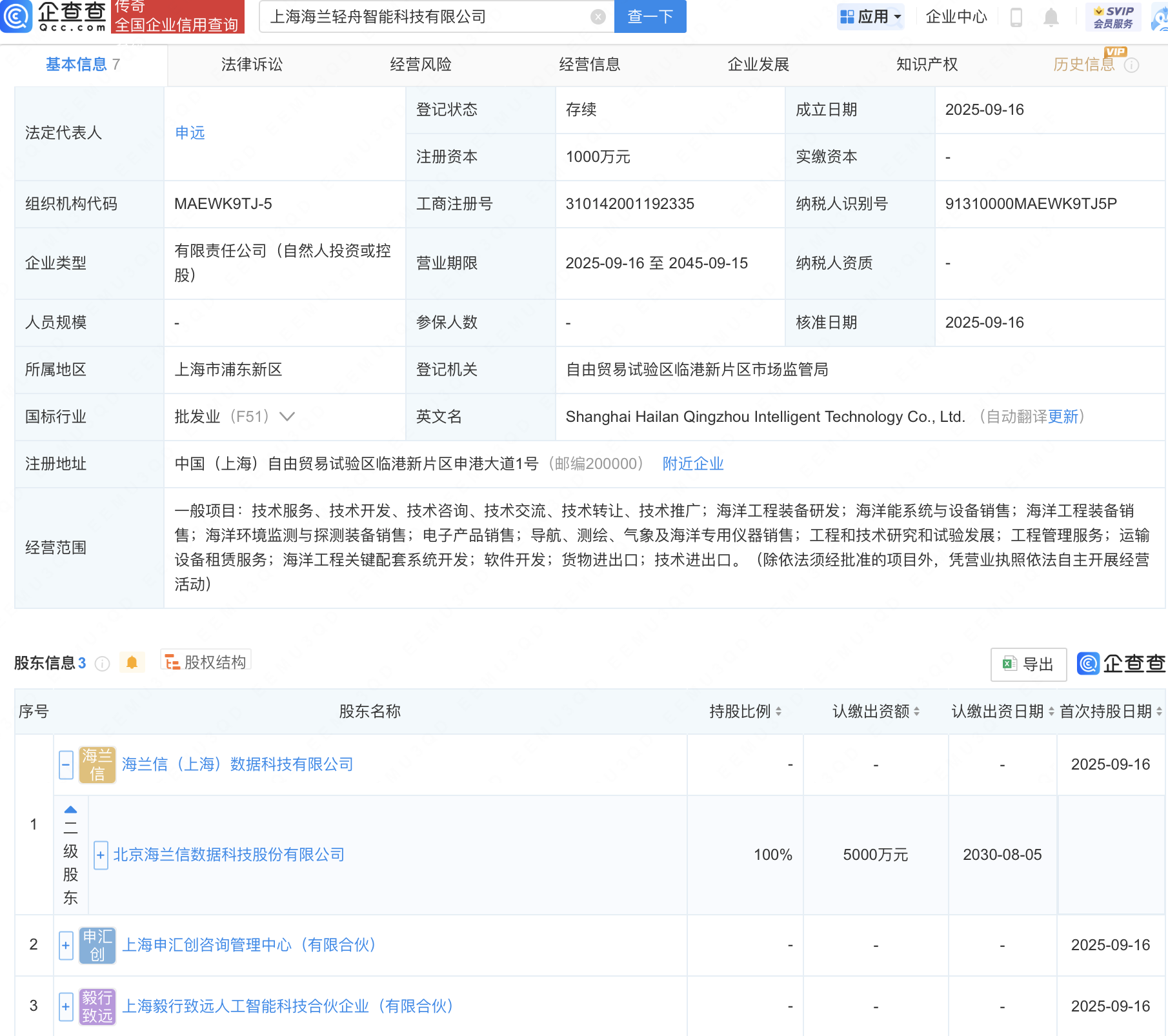 近日imtoken钱包app,上海海兰轻舟智能科技有限公司成立,注册资本1000万元,经营范围包含:海洋工程装备研发;海洋能系统与设备销售;海洋工程装备销售;海洋环境监测与探测装备销售等。企查查股权穿透显示,该公司由海兰信(300065)全资子公司海兰信(上海)数据科技有限公司等共同持股。